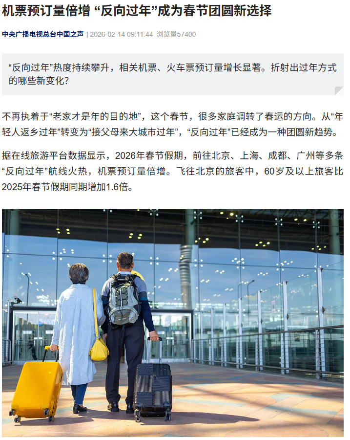 IT之家 2 月 14 日消息,据央视新闻报道,不再执着于“老家才是年的目的地”,这个春节,很多家庭调转了春运的方向。从“年轻人返乡过年”转变为“接父母来大城市过年”,“反向过年”已经成为一种团圆新趋势。