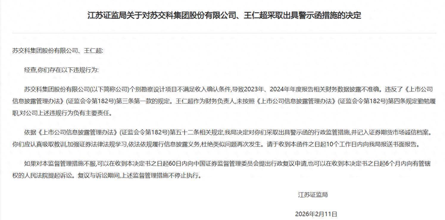 2月11日,根据江苏证监局发布的公告,苏交科(300284)及其财务负责人王仁超因个别勘察设计项目不满足收入确认条件,导致2023及2024年报相关财务数据披露不准确,被采取出具警示函的行政监管措施。